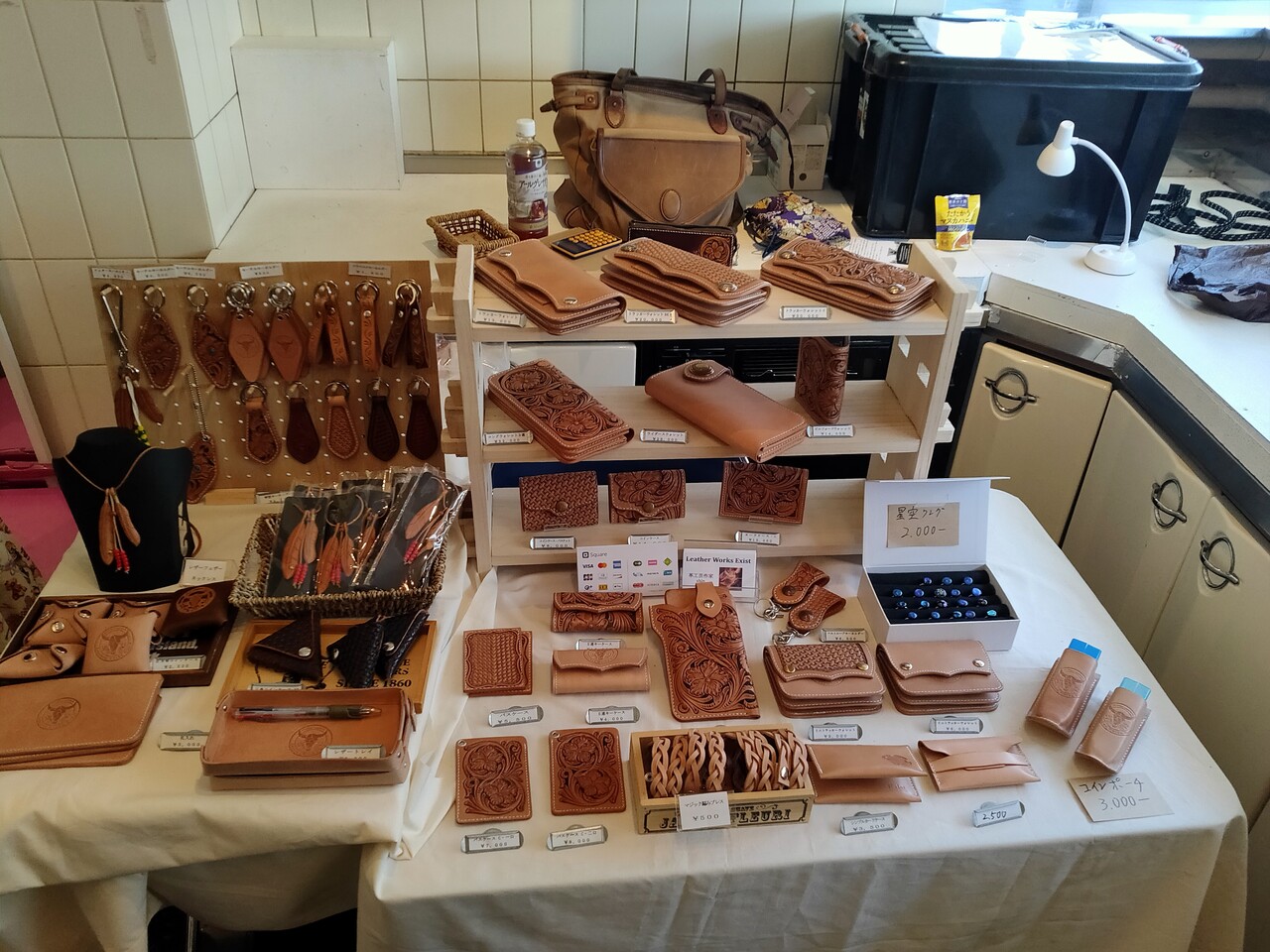 「これは何だろう?」と興味を持ってくださった方には、レザーカービングの制作工程を見せたり、自作の革製品の経年変化を紹介するなどして、作品の魅力を伝えました。