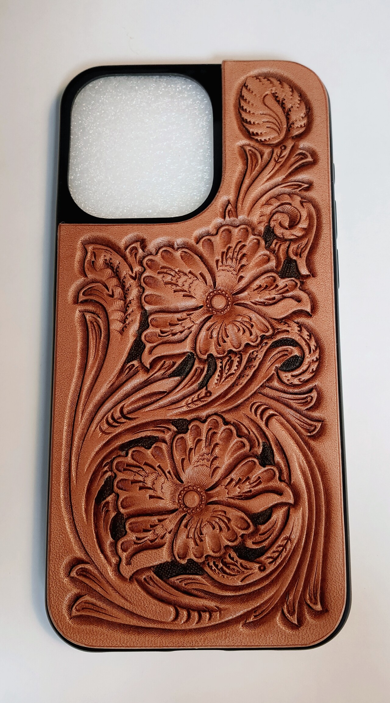 具体的には、レザーカービングを施した革を、スマホカバー本体にゴムノリで丁寧に圧着する
