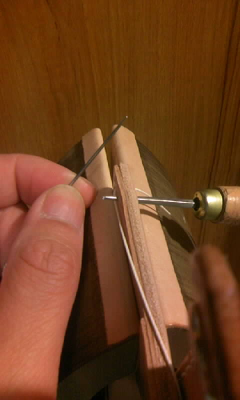 ですので写真のように巾の狭い菱錐で一穴ずつ開けながら手縫いで縫っていきます